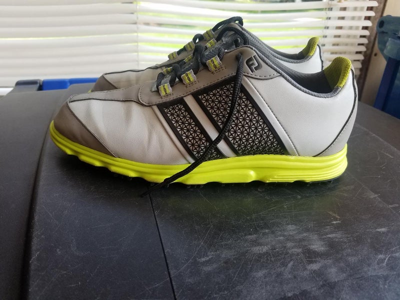 Boys FootJoy golf shoes size 5 medium. Grey with fluorescent green trim. Worn for only one summer. Like new condition.