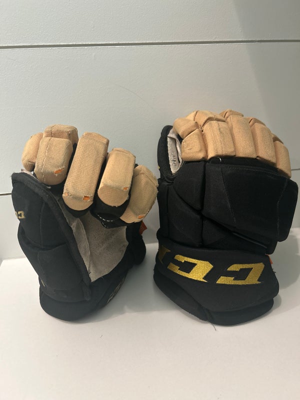 CCM Pro Stock hockey gloves in Vegas Golden Knights colors, size 14. Used. $60 or best offer, plus shipping.