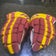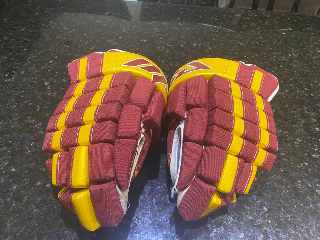 Slightly Used Very light weight MIA Crimson & Yellow gold hockey gloves 14"