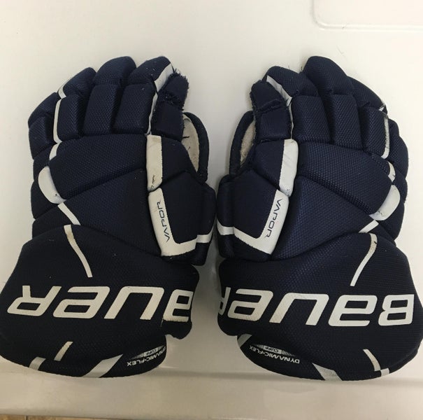 Size 13” Navy Bauer Vapor X20 gloves. These are used and have a hole in the right glove
