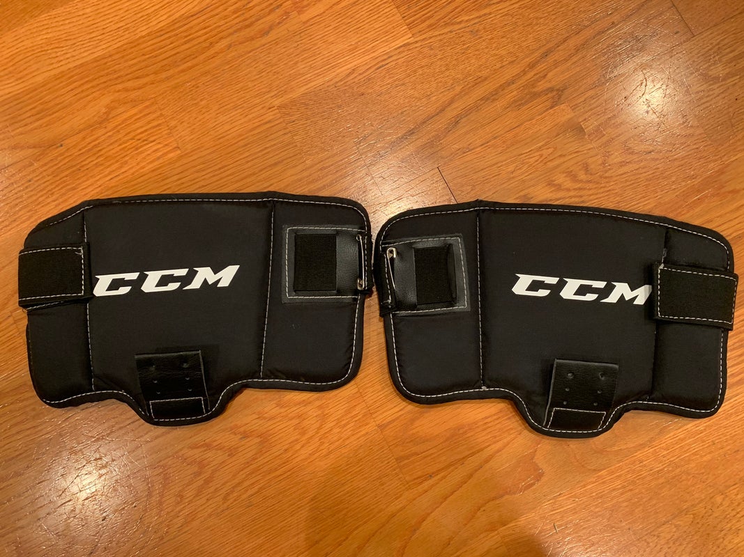 CCM thigh guards appear to be used but also appear to be in really good shape. I don't know their history. Someone gave them to me, but I don't need/want them. See photos for dimensions.