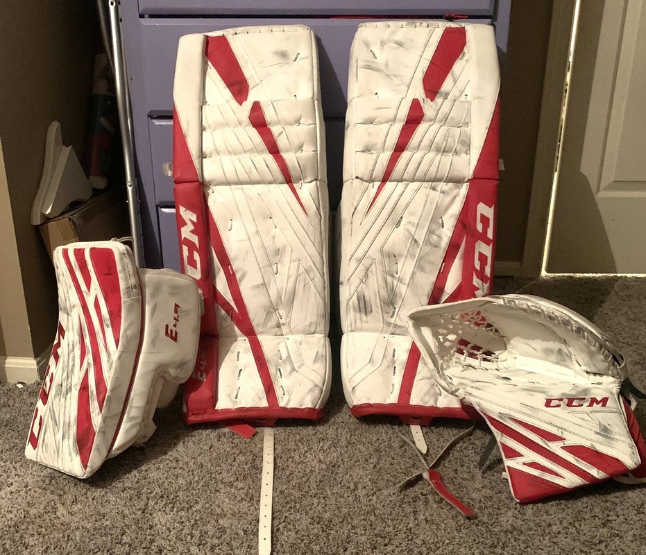 Red Intermediate 32" CCM Extreme flex 4.9 leg pads, glove, blocker