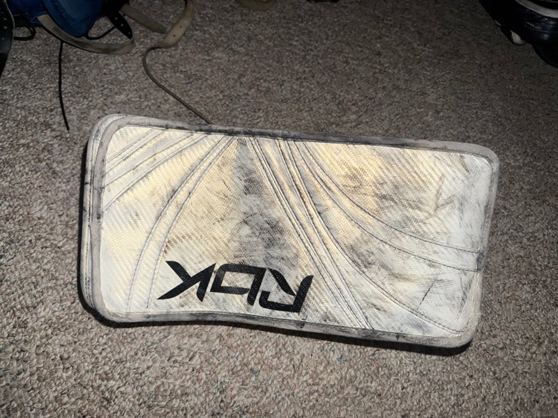 This listing is for a used Reebok senior regular-hand goalie blocker. The blocker’s design focuses on reliable hand protection and rebound control, featuring a standard rectangular board that helps direct shots to safer areas on the ice. The Reebok construction offers adequate padding without excessive bulk, allowing for decent mobility and quick stick handling during saves. The white color is a typical choice that matches most goalie gear.