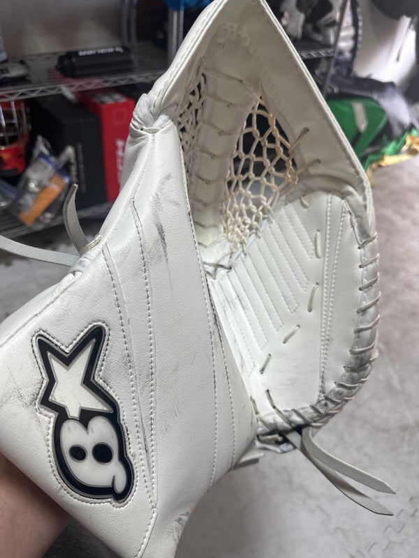 This listing is for a used Brian's Eclipse goalie glove, size regular, designed for senior players and released in 2024. I bought it to try out after hearing good things about the model, but the break and feel just weren't the right fit for me. At that time, I was trying to find the best equipment to compensate for my skill level, but this glove didn’t quite work out. It’s a white glove only, not part of a bundle or pack. If you’re looking for a 2024 Brian's Eclipse glove in regular fit and senior size, this could be an option. The condition is used, reflecting normal wear from being tried out.