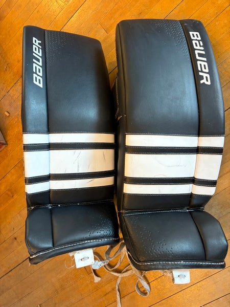 Bauer 2020 Junior Medium 28 inch GSX Goalie Leg Pads. Some wear in knees and original toe straps swapped out for laces. Price reflects that. Velcro is all sticky and in great shape. No tears.