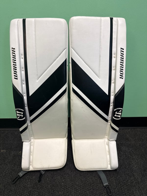 White & Black Junior Warrior Ritual G6 E+ Goalie Leg Pads (Used) | 30"+1"
