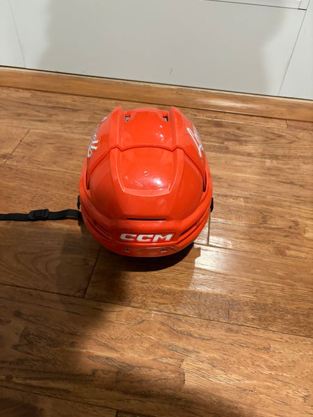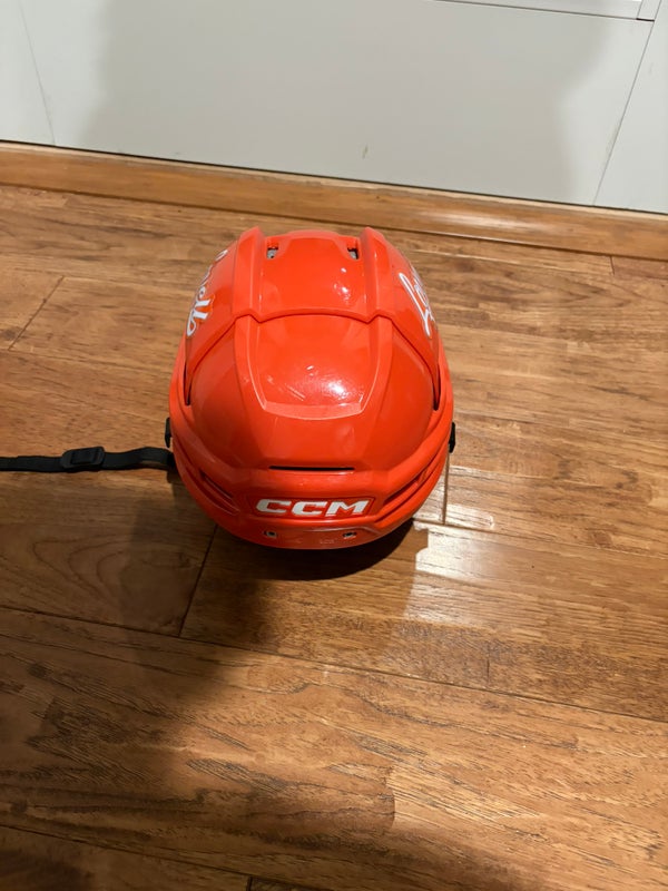 This listing is for a medium-sized CCM Tacks 720 hockey helmet in orange. It has been used for about half a season and shows normal signs of wear consistent with that amount of use. The helmet is designed for recreational or competitive players and offers reliable protection. As a retail model, it does not have pro-stock specifications. The CCM Tacks 720 is a mid-level helmet known for a balance of comfort and safety. It is suitable for players looking for a trusted brand helmet in a medium size. This helmet is being sold as a single unit and has no additional parts or accessories included.