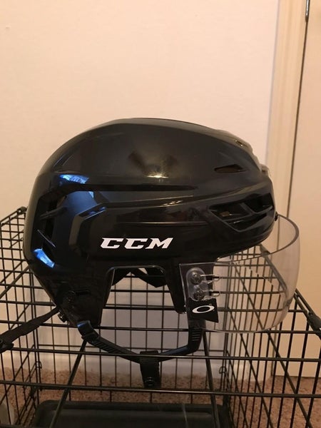 Brand new. Just took the stickers off. Comes with Oakley visor that is slightly used but in great condition. Helmet comes with ear pieces. Large, black