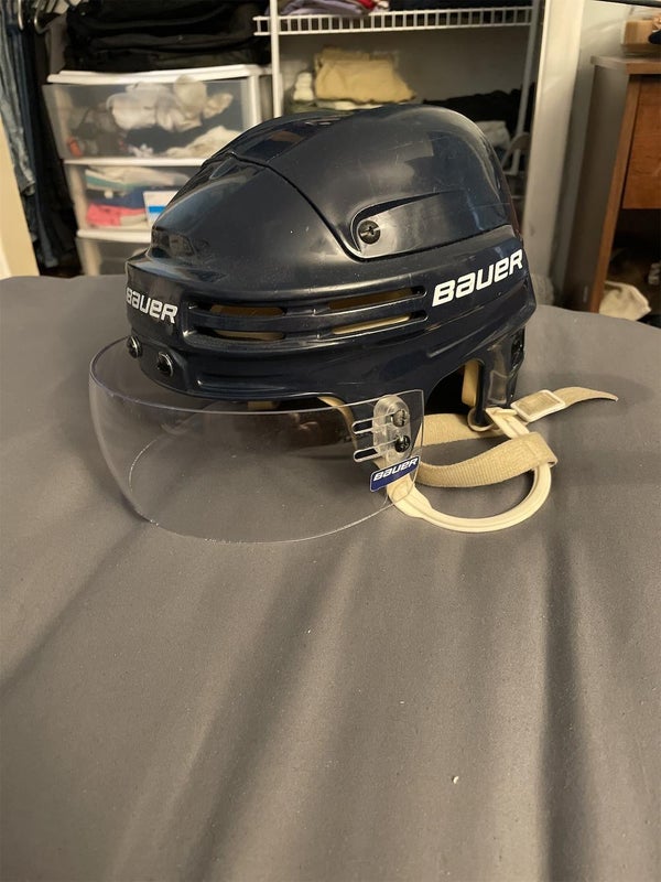 Used Bauer 4500 helmet with a pro stock Bauer visor. Visor came from the Bakersfield Condors, not sure on exact model. Helmet is in good shape and the visor has one small scratch shown in the last photo