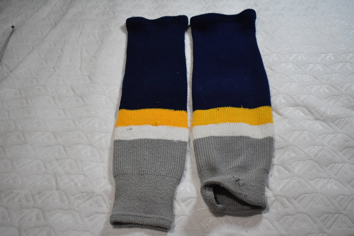 Knit Striped Hockey Socks, Blue/White/Gold/Gray, 24 Inches