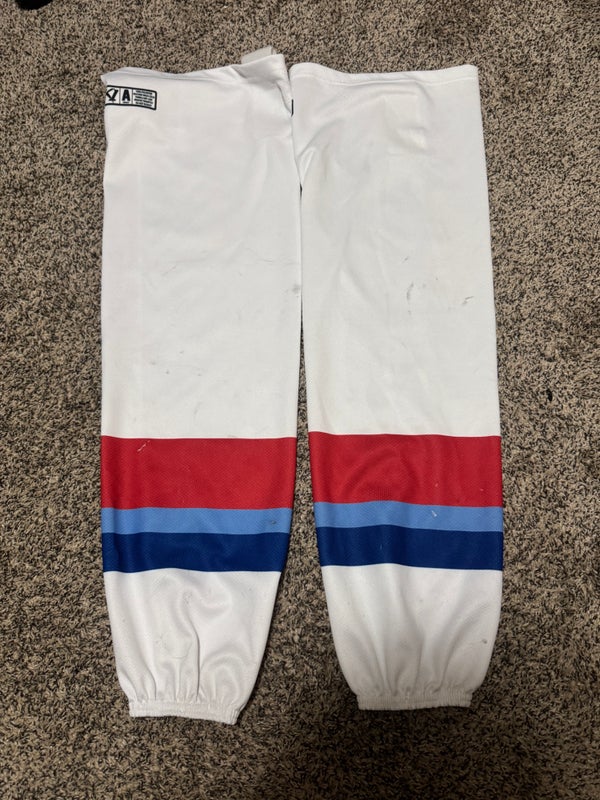 White Blue Red NAHL Junior A Maine Nordiques Senior Large SP EDGE STYLE Socks Pro Stock (Used)