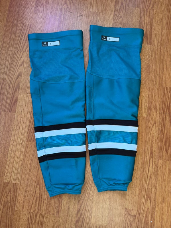ITEM DESCRIPTION: 2024/5 San Jose Sharks teal game-worn game socks, size Large. Fully functional or great for collecting. #1