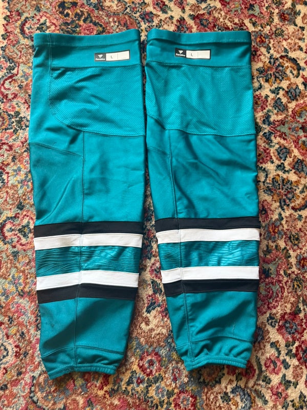ITEM DESCRIPTION: 2024/5 San Jose Sharks teal game-worn game socks, size Large. Fully functional or great for collecting. #4
