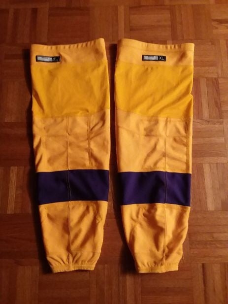 Los Angeles Kings worn gold socks w/purple stripes vintage/throwback games (Reebok XL Kevlar linings