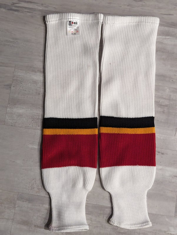 New Men's Adult Medium White KOBE Athletic Knit Ice Hockey Socks with Red, Black yellow pipe