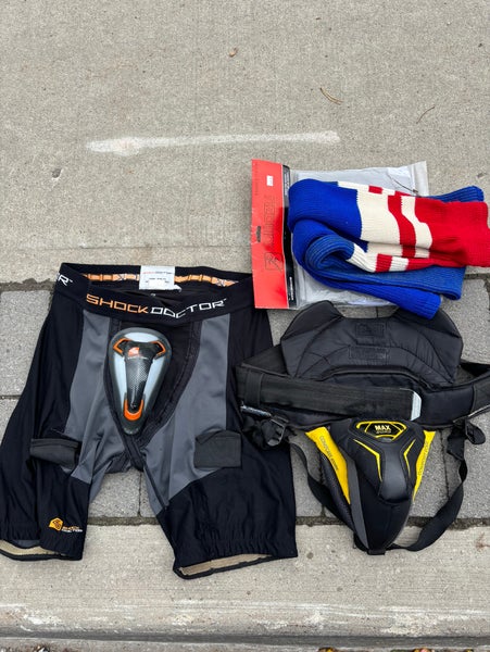 Two men’s jocks - goalie is supreme double cup great protection other is higher end shockdoctor pro cup XL and goalie is L senior men’s sizes used but still life left - comes with brand New Jersey and old school socks feel free to make an offer I want it gone