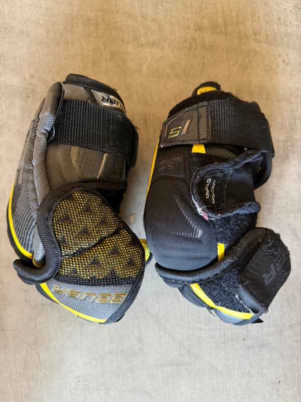 These are Bauer Supreme 1S elbow pads in a junior small size. They are used but remain fully functional, with all straps and Velcro intact and operational. The pads have been worn but do not have any damage affecting their use. These elbow pads are designed for junior players and provide the necessary protection during play. The small size is suitable for younger athletes who need reliable elbow protection on the ice.