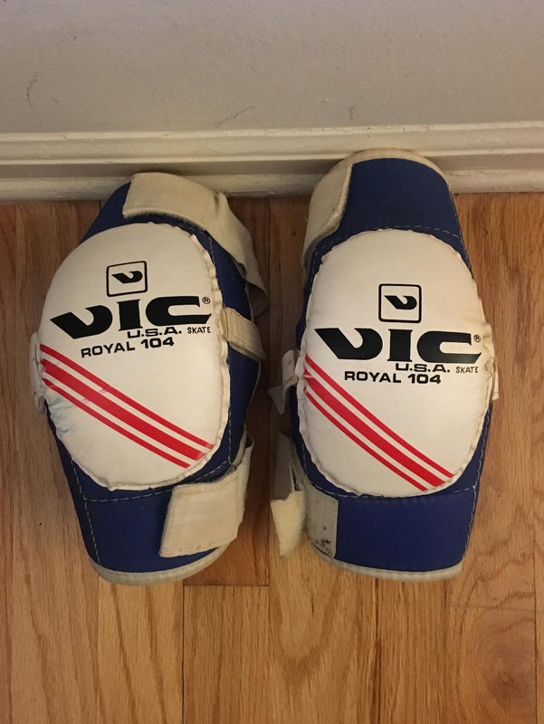 Vintage Blue and white Vic Royal 104 soft cap Elbow Pads. Heavily used and battle worn. Velcro straps a little stretched but still holds pads on. Great for beer league play or anyone looking to collect old school hockey gear.