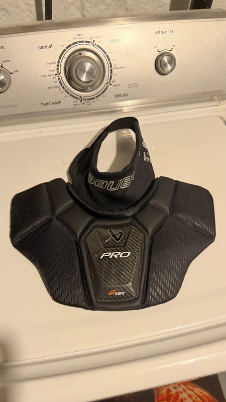 BAUER PRO CERTIFIED NECK GUARD - SENIOR. Never used, I prefer a dangler and a padded shirt to a neck guard.