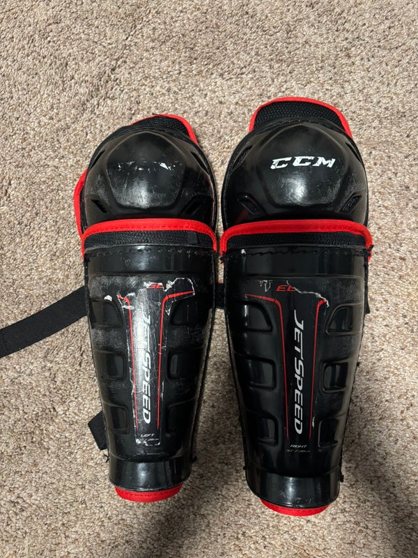 CCM JetSpeed youth shin pads. Moderately worn. Stickers peeling, padding and shell all intact.
