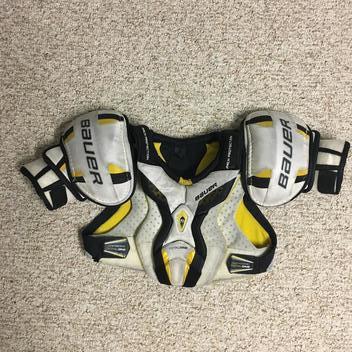 Bauer Total One shoulder pads. Size senior small. No major rips/flaws. Worn for about 2 seasons. Velcro still works great.