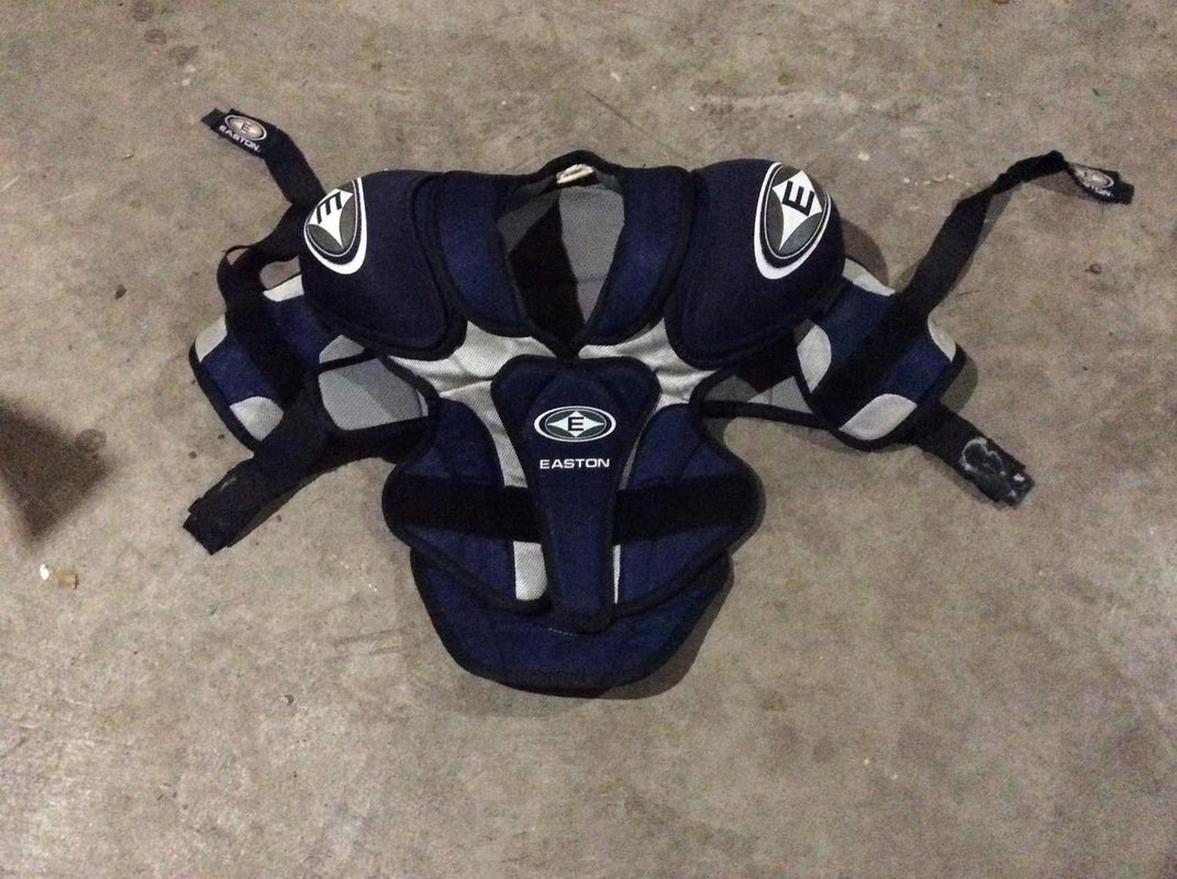 Easton Senior Small shoulder pads. One small tear on the upper left backside, as pictured. Complete functionality of all pads and straps. Thank you for looking