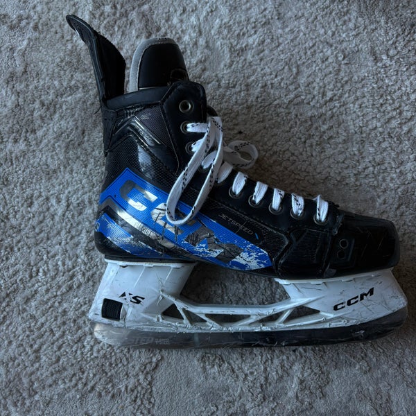 The CCM Jetspeed FT6 Pro is a high-performance hockey skate designed for speed and agility. It features a one-piece boot for a comfortable fit and excellent range of motion, along with an ADPT comfort tongue for added flex and fit. Equipped with a Step Blacksteel blade, it offers better edge life and smooth gliding.