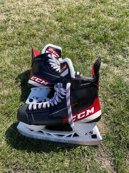 The CCM JetSpeed FT475 skates are part of CCM's 2021 lineup, designed to offer a balance of speed and comfort for players seeking reliable performance on the ice. These senior-size 11 skates feature a tapered fit that supports quick turns and acceleration while maintaining stability. The boot construction provides a snug yet comfortable feel, helping with energy transfer and stride efficiency. As a new pair, these skates come unused, retaining their factory shape and stiffness, ready to break in.