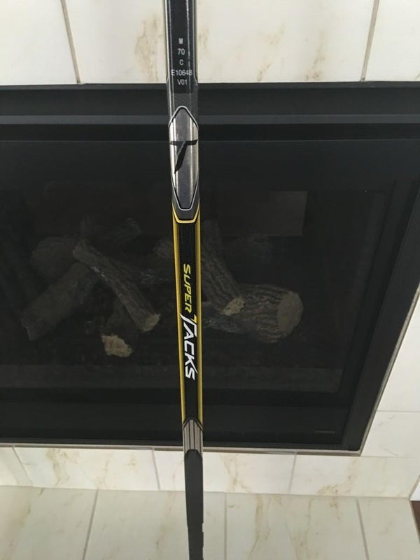 Super Tack CCM pro stock stick . Lefty . Sakic curve. Extended shaft . Sand paper blade. Extra grip. Round shaft. Never used or cut just partially spray painted above blade