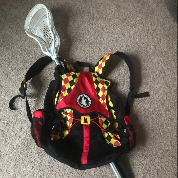 Flow society gear bag. Fits everything you need for lacrosse and has a stick holder all in a backpack. 2 side pockets and bottle holders.