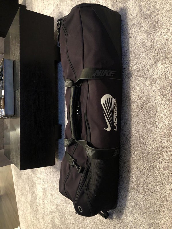 Lightly used Nike lacrosse bag with no rips, tears, stains, or odor. Currently holds a helmet, 2 sticks, 2 pairs of shoulder pads, gloves, arm pads, 2 pairs of cleats, jerseys and many accessories with room to spare (equipment not included). Large main compartment, separate stick and shoe compartment.