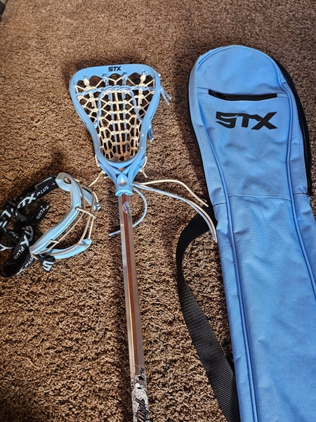 STX Myth lacrosse stick, bag, and protective eye gear