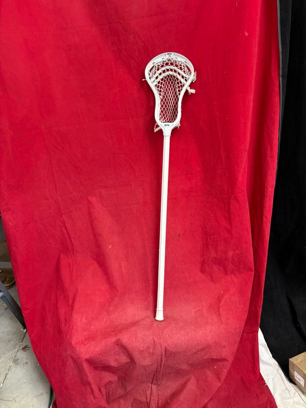 Lacrosse Stick: STX brand lacrosse stick with a white head and shaft. Size: M 40” top to bottom