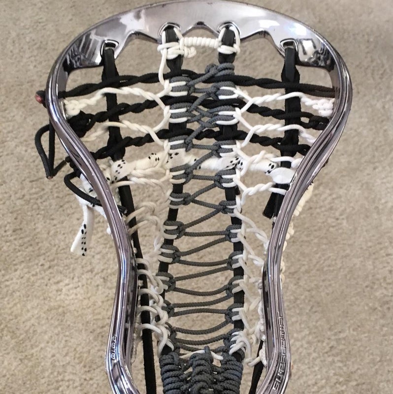 This head is strung up with a rocket pocket. The color of the Head is a very shiny(mirror like) dark grey. The Head is on a Warrior shaft, color hot pink! It is used but it still has a ton of life left in it. If you have never used a rock it pocket before, they take some getting used to but once you practice with it a bit you will love it.