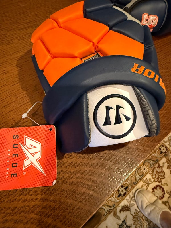 Nemesis QS size XL goalie gloves. Brand new with tag. Orange and Navy with embroidery on thumbs.