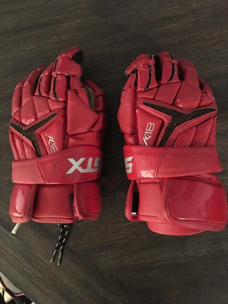 Used red 13" STX K18 lacrosse gloves. No holes. No large notable marks just a few fray's in stitching but nothing to big. Name is written inside as seen in the last picture but not noticeable when gloves are on.