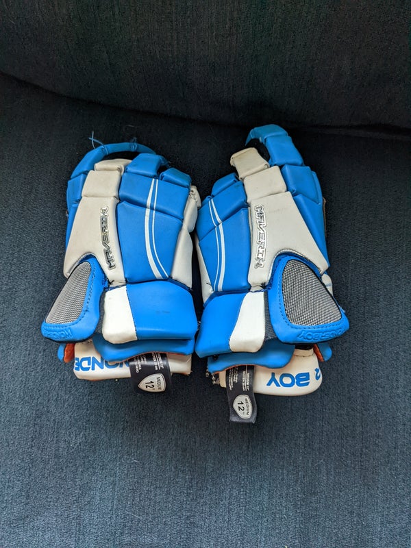 Used lightly for two youth seasons. Excellent condition. Maverik Wonder Boy 12” lacrosse gloves in royal blue and white.