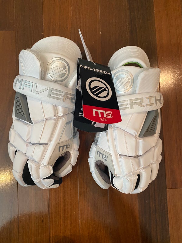The Maverik M5 Lacrosse Glove, successor to the M4, features a classic fit with added volume in the fingers and back of the hand. It includes a Quickdry Liner for moisture management, an AX Suede palm for durability and comfort, and Inhaler Mesh palms for airflow and grip. The Flowcool venting helps disperse heat, while the adjustable cuff allows players to choose between a closed fit for protection or a flared fit for wrist mobility.