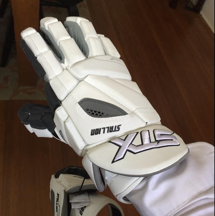 These are never used, tags are still on them as well as elastic string to connect both gloves. They were issued by Providence College lax team. Great flex and mobility as well as protection. Fresh clean white look.