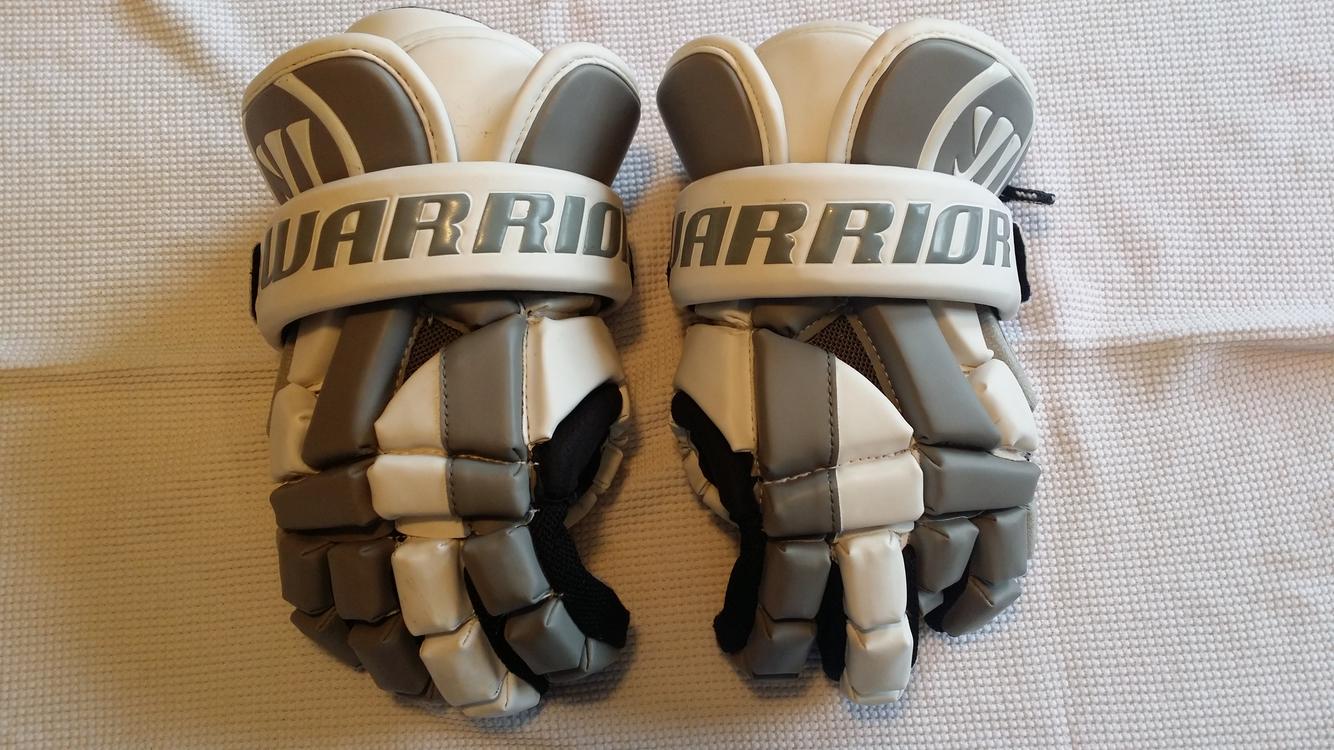 Warrior Riot gloves, 12". White and gray. Palms in excellent shape, no holes, leather isn't crusty. Drawstring is missing from the right glove but gloves are completely functional and usable.