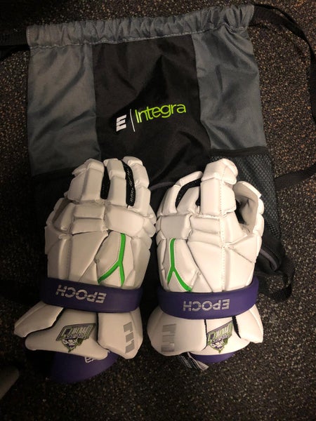 The Epoch Integra Lacrosse Gloves utilize Phase Change Technology for optimal temperature and moisture control, ensuring comfort. They feature a Tri-Layer Dual Density Foam Stack with Carbitex for lightweight impact absorption. Designed for maximum feel and control, the gloves have seamless fingertips, a one-piece palm, and an extended cuff for an ergonomic fit.