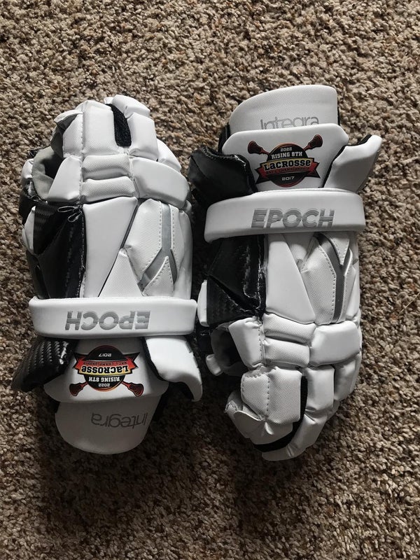 The Epoch Integra Lacrosse Gloves utilize Phase Change Technology for optimal temperature and moisture control, ensuring comfort. They feature a Tri-Layer Dual Density Foam Stack with Carbitex for lightweight impact absorption. Designed for maximum feel and control, the gloves have seamless fingertips, a one-piece palm, and an extended cuff for an ergonomic fit.