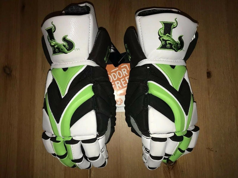 Up for sale are an hard to find, incredible pair of New With Tags custom embroidered Warrior Rabil line gloves. This is a team issued pair of Major League Lacrosse Gloves that are white, glossy green and matte black. The number 13 and Lizards logo are embroidered. These were a gift and I kept them on display in my office and never took the tags off them. I am downsizing and they are really one of a kind for someone looking for summer gloves or a fan of the Lizards or Paul Rabil line.