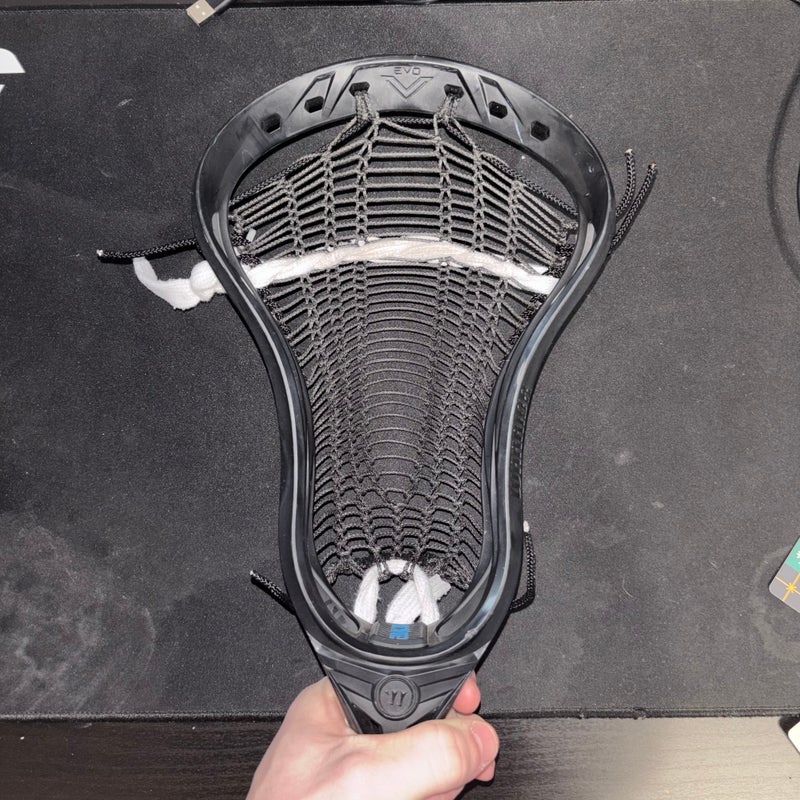 The Warrior Evo 5 was the head of choice by players such as UVA attackman Xander Dickson. It's made to be light and accurate with a ton of ball control. It's got a lot of sidewall holes that would allow for multiple sidewall patterns, so you have a ton of different stringing options. Some players like to do a high pocket with a little bit more whip, and some like a mid to low pocket for less whip and more control. This head is for players who'd like to have the ball lower in the pocket, but it's also versatile in what you can do with it.