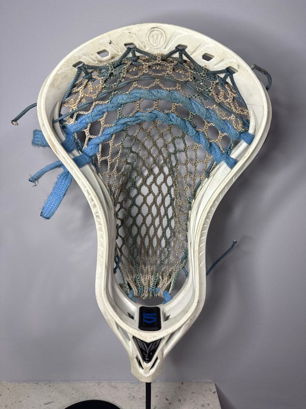 The Warrior Evo 5 was the head of choice by players such as UVA attackman Xander Dickson. It's made to be light and accurate with a ton of ball control. It's got a lot of sidewall holes that would allow for multiple sidewall patterns, so you have a ton of different stringing options. Some players like to do a high pocket with a little bit more whip, and some like a mid to low pocket for less whip and more control. This head is for players who'd like to have the ball lower in the pocket, but it's also versatile in what you can do with it.