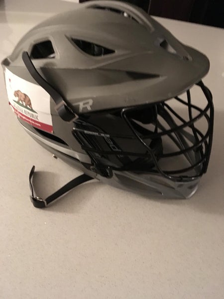 This is a matte gray used cascade r. There is a California lacrosse republic sticker that is removable on the helmet.
