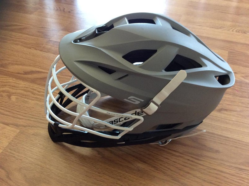 Like new gray helmet with white cage and white chin strap. Used one season and only slight markings on back above the label