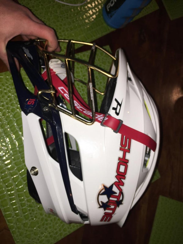 This helmet is in very good condition and was used in just a few games. It is red, white, and blue. It has a gold chrome face mask. Red chinstrap. The stickers all around the helmet are removable. Adjustable size. No Trades.