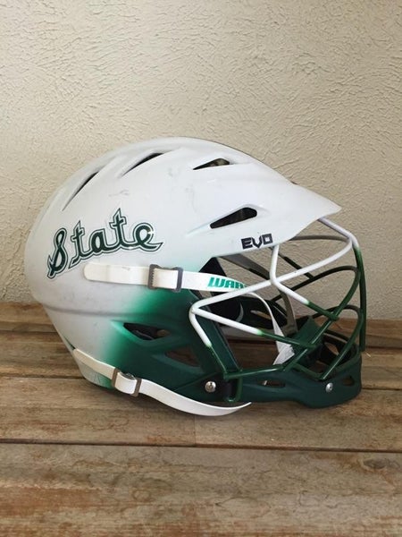 Game worn MSU Lacrosse Helmet. Missing adjuster nob on back, but you can still adjust the helmet without it