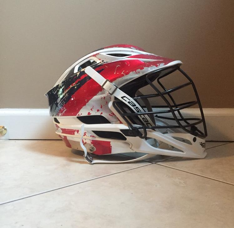This is a Barely Used White Cascade R helmet with a Custom USA wrap. This is the wrap made from LookofLacrosse. I purchased a brand new white helmet with black mask and put this wrap on it. Was used for a few weeks but then I got a team helmet. Includes a black chin strap. It is in excellent condition with minor chips and marks.